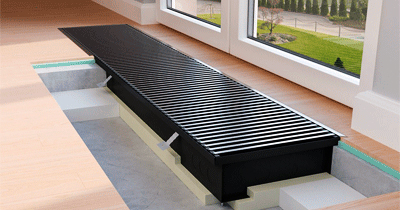 - Водяной однорядный теплообменник. Минимальная глубина корпуса — от 80 мм. Подходит для тонких стяжек, но мощность на погонный метр ограничена — компенсируют увеличенной длиной установки.