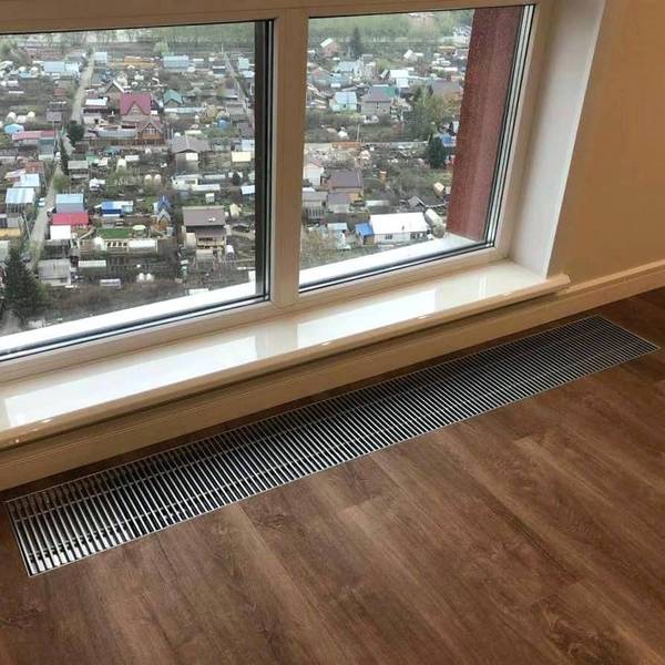 Внутрипольные конвекторы с принудительной циркуляцией — наиболее технологичное решение, требующее планирования на этапе строительства. Они монтируются в нишу пола глубиной от 90 до 300 мм, длиной от 0,5 до 6 метров (под заказ изготавливаются даже угловые и радиусные модели для эркеров). Существует также экзотическая разновидность с приточной вентиляцией: холодный наружный воздух подаётся по вентиляционным каналам прямо в корпус конвектора, где мгновенно нагревается и поступает в помещение — решение «два в одном» для вентиляции и отопления.